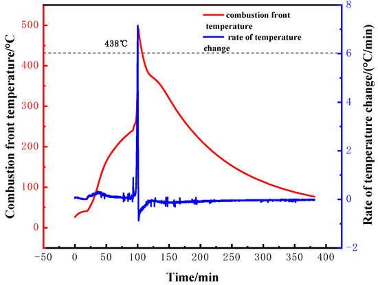 During the experiment, a flue gas analyzer was used to monitor the concentrations of CO, CO2, and O2 in the produced flue gas in real-time, generating curves of flue gas composition versus time, as shown in Figure 6. When the combustion front formed, the O2 concentration dropped from 21% to approximately 5%, while CO and CO2 concentrations increased rapidly to around 8% and 13%, respectively.
