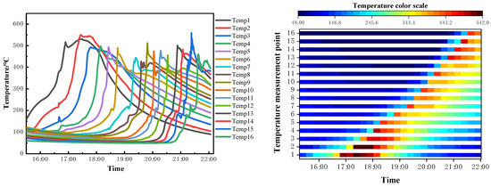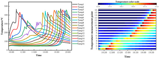 Sixteen thermocouples were evenly distributed along the one-dimensional combustion tube model, and the temperature acquisition system recorded the temperature at each monitoring point along the combustion tube from ignition to the end of combustion. The temperature field distribution is shown in Figure 3, Figure 4 and Figure 5.