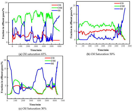 From Figure 6, it can be observed that as the experiment progresses and the combustion front advances, oxygen is consumed while CO2 and CO are produced. When oxygen consumption is at its peak, a large amount of CO2 is generated along with a smaller amount of CO. In Figure 6c, the sudden increase in oxygen levels at approximately 400 min can be attributed to the instability of the combustion front observed under low oil saturation (30%) conditions. This instability may be due to insufficient fuel supply, brief fluctuations in air injection, or localized cooling, which reduce the efficiency of oxygen consumption during combustion.