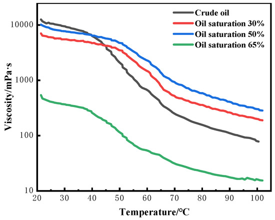 The viscosity–temperature performance of the original crude oil sample and the produced oil under different oil saturations after in situ combustion was tested using the HAARKE RS6000 rheometer (HAAKE, Vreden, Germany). The results are shown in Figure 7.