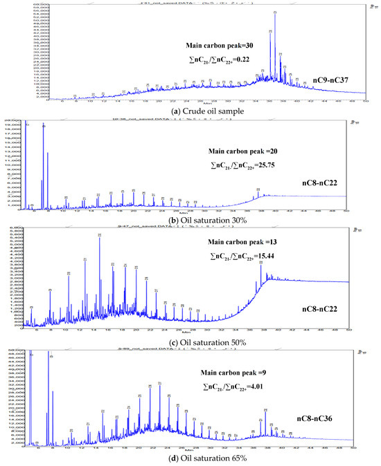 From Figure 8, it can be observed that the main carbon peak of the crude oil shifts forward after ISC. Specifically, the main carbon peak of the crude oil, originally at C30, shifts to C20, C13, and C9, respectively, under different oil saturation conditions. The proportion of light components increases significantly. The light-to-heavy hydrocarbon ratio of the original crude oil was 0.22, which increased after high-temperature oxidation during in situ combustion to 25.75, 15.44, and 4.01, respectively.