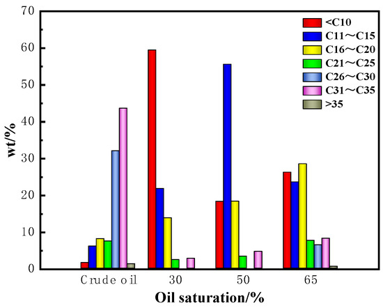 At an oil saturation of 30%, the main carbon peak shifts forward the most, indicating the greatest increase in light components and the highest light-to-heavy ratio, resulting in the best crude oil upgrading effect.