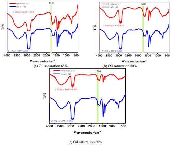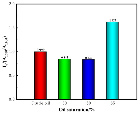 The infrared spectrum of different frequencies and intensities can reflect the structure and relative content of different molecular functional groups. The iS10 infrared spectrometer was used to analyze the infrared spectra of both the raw oil sample and the produced oil. Since it is difficult to maintain consistent sample film concentrations during actual measurements, the method of comparing the intensity ratio of functional group absorptions—specifically the oxygen content index (A1700/A1600)—was adopted to describe the degree of oxidation of crude oil during the ISC process. The absorption peak at 1600 cm−1 corresponds to the vibration of the C=C double bond in the aromatic ring, representing the skeletal vibrations of aromatic hydrocarbons. The absorption peak at 1700 cm−1 is associated with the stretching vibration of the carbonyl group (-C=O), which is characteristic of functional groups such as esters, ketones, and carboxylic acids. Figure 10 illustrates the infrared spectra of crude oil before and after ISC under different oil saturation conditions and the impact of oil saturation on the infrared absorbance of crude oil before and after ISC. Figure 11 shows a comparison of A1700/A1600 characteristics of ISC-produced oil under different oil saturation conditions and crude oil.