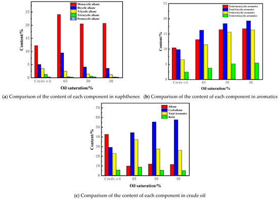 To further elucidate the upgrading effects of ISC on crude oil under different oil saturation conditions and describe the combustion state of crude oil during the process, GC-MS analysis was performed on the saturated and aromatic hydrocarbons in the produced oil. The results before and after ISC are shown in Figure 12.