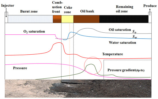 It can be seen from Figure 13 that the distribution of reservoir zones and key parameters during the high-temperature in situ combustion (ISC) oil displacement process, including the burnt zone, combustion front, coke zone, oil bank, and remaining oil zone. The temperature ranges for different zones are as follows: burnt zone (800–1000 °C), combustion front (600–800 °C), coke zone (400–600 °C), oil bank (200–400 °C), and remaining oil zone (<200 °C). It also shows the variation in critical parameters such as oxygen saturation, oil and water saturation, pressure, temperature, and pressure gradient across these zones. Decreases significantly in the burnt zone and coke zone as the oil is consumed or transformed. Peaks in the oil bank and then gradually decreases in the remaining oil zone. It captures the complex mechanisms of oil combustion, thermal cracking, and displacement, illustrating how heat and pressure are utilized to mobilize and recover oil efficiently.