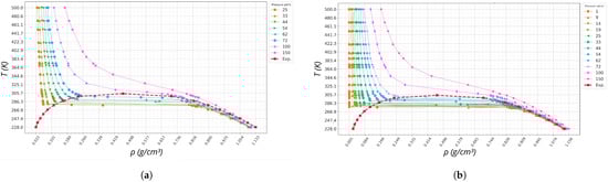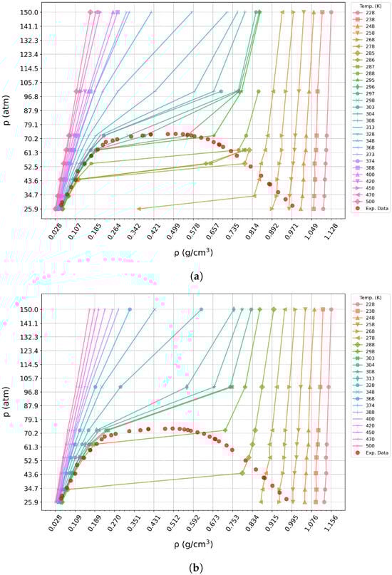 Guggenheim’s seminal work [46] laid the foundation for analyzing gas–liquid coexistence behavior, particularly near the critical point where the liquid and vapor densities converge and become indistinguishable. This diagram is particularly useful because it highlights the coexistence of phases by showing how the liquid and vapor densities evolve as the system approaches the critical point along isobars. In the case of subcritical pressures, we observe two distinct branches: one corresponding to the liquid phase (high density) and the other to the vapor phase (low density). These branches converge as the temperature approaches the critical temperature and the isobar is close to the critical pressure , and at the critical point, both branches merge into a single density value. The CO2 critical point is well established in the literature [47,48,49,50]: = 72.9 atm and = 304.2 K. Building on this approach, we begin our discussion by presenting the behavior of T versus along subcritical, critical, and supercritical isobars for both models: TraPPE-small in Figure 1a and EPM2 in Figure 1b. For comparison, we also include the experimental results from [29] in both phase diagrams.