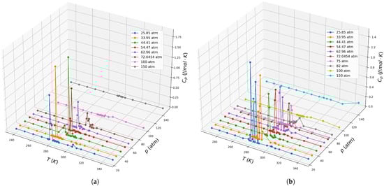 By evaluating the specific heat capacity along the isobars, , as shown in Figure 3a,b for the TraPPE-small and EPM2 models, respectively, we observe that this thermodynamic response function exhibits a discontinuity at the liquid-gas phase transition for both models. The behavior of observed in our study mirrors the trends reported by Span and Wagner [47], who utilized caloric data to refine CO2 equations of state. Additionally, the peaks in along the critical isobar, indicative of the Widom line, align well with the experimental observations of Duschek et al. [49]. These findings underscore the capability of both models to capture critical phenomena and thermodynamic response functions with high fidelity. Consistent with the behavior expected in a first-order phase transition. As the system approaches the critical point, this discontinuity evolves into a peak at the critical pressure, reflecting the inflection in the isobar and the absence of latent heat, characteristic of the continuous nature of the transition beyond the critical point. In the supercritical regime, the maxima in corresponds to the Widom line, which terminates at the gas–liquid critical point.