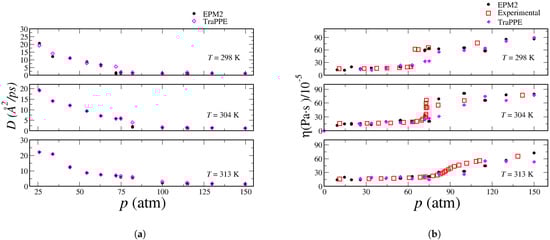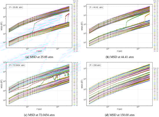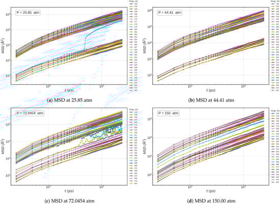 Similarly, the EPM2 model successfully captures the dynamics across both subcritical and supercritical isobars, as reflected in the corresponding MSD profiles shown in Figure 5a–d. However, while these findings demonstrate the model’s ability to differentiate between dynamic regimes, they do not confirm whether the models can accurately predict experimentally measurable dynamic properties, such as diffusion coefficients or viscosity.