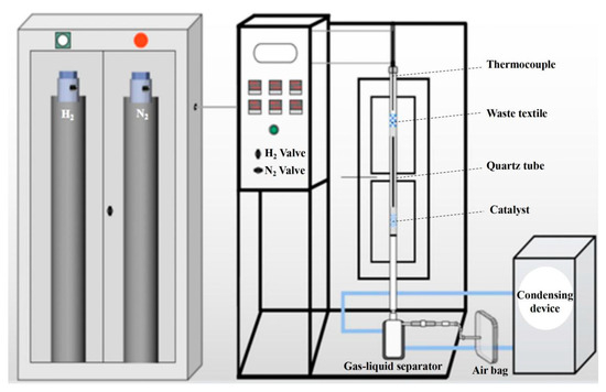 Waste textiles (Guangzhou, China) were cut into small squares (4 × 4 mm) and dried at 110 °C for 12 h prior to testing, following the procedure outlined in our previous research [22]. Ni(NO3)2·6H2O, of analytical grade, was purchased from Shanghai Aladdin Biochemical Technology Co., Ltd. (Shanghai, China). Al2O3 was purchased from Zhuoran Environmental Protection Technology (Dalian) Co., Ltd. (Shanghai, China). N2 (99.99%) and H2 (99.99%) were purchased from Zhaoqing High-tech Zone Heng’an Industrial Gas Co., Ltd. (Shanghai, China). The above reagents were used as received, without any additional purification.