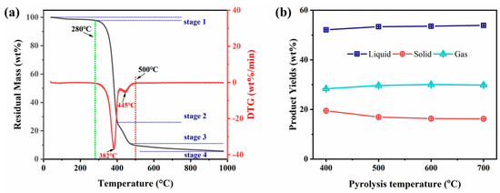 (a) Mass decay pattern and differential thermogram of waste textile; (b) influence of pyrolysis temperature on three-phase products. The black solid line represents the weight loss curve, and the red solid line represents the DTG curve in a.