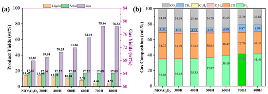 The fresh catalyst was evaluated in the pyrolysis–catalytic process; as shown in Figure 3a, the gas yield was 67.87%, the liquid yield was 14.47%, and the remaining fraction comprised a solid yield. The permanent gasses produced during the catalytic step primarily consisted of H2, CO, and CO2, with trace amounts of light hydrocarbons such as CH4, C2H4, and C2H6 also detected; the gas compositions are displayed in Figure 3b. The H2 concentration reached 35.08%, which could provide a reductive atmosphere to change the status of the Ni species [21,25]. Thus, the catalytic performances of the catalysts after hydrogen reduction at different temperatures were investigated. The gas yield increased from 67.87% to 78.46% as the hydrogen reduction temperature was raised from 300 to 800 °C, while the liquid yield decreased from 14.47% to 4.46%, suggesting the increase in the reduction temperature was beneficial to improve the permanent gasses’ yield. It might be ascribed to the production of more metallic Ni species at higher reduction temperature, which would promote C-C and C-H cleavage [26], leading to converting long-chain compounds to short-chain permanent gasses. The solid yield was almost identical at different reduction temperature, due to the formation of solid carbon tightly related to the reaction conditions of pyrolysis section rather than the catalytic section.