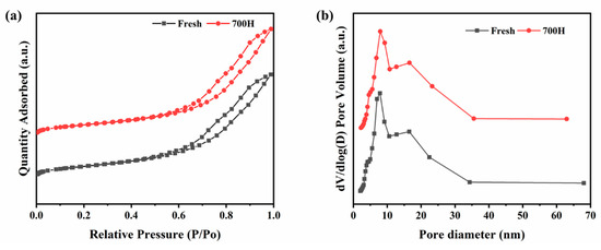 (a) N2 adsorption–desorption isotherms and (b) pore size distributions of the fresh and 700H catalysts.
