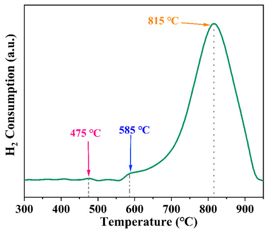 To investigate the behavior of the prepared catalyst towards reduction, a H2-TPR test was conducted. As depicted in Figure 5, a large and broad reduction peak was observed at about 815 °C along with a smaller peak located near 475 °C and a shoulder peak positioned around 585 °C. It has been widely confirmed that the reduction peaks observed between 250 and 600 °C correspond to NiO, which interacts to varying extents with the Al2O3 support [18]. The reduction peaks below 400 °C were assigned to free NiO species, which have a very weak interaction with the support, while those between 400 and 600 °C were attributed to NiO species with a moderate interaction with Al2O3. The reduction peaks around 750 °C were ascribed to the NiAl2O4 spinel. The formation of a stable Ni-Al spinel structure, which was caused by the diffusion of Ni2+ ions into the tetrahedral voids on the Al2O3 surface, leads to a stronger metal-support interaction [30]. The reduction peaks at 475 and 585 °C were assigned to NiO, while the peak at 815 °C was attributed to NiAl2O4. From the above findings, it can be concluded that the Ni species in the catalyst were predominantly in the form of NiAl2O4 spinel, with a small amount present as NiO.