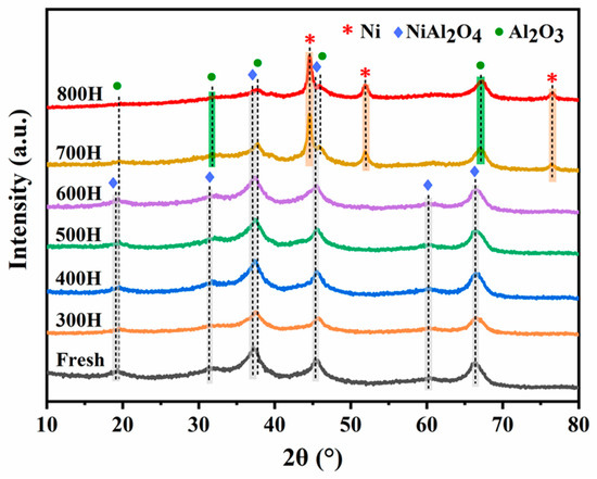 The Ni loading of the fresh catalyst was 7.78 wt.% examined by ICP, very close to the theoretical value, indicating almost all of the Ni was loaded into the catalyst. The phase composition and crystal structure of both the fresh and reduced catalyst samples were analyzed using XRD. As displayed in Figure 6, no diffraction peak of NiO was observed. It has been reported that NiO can readily react with Al2O3 to form nickel aluminate at relatively low temperatures [31]. It was reported the crystalline phases of the Ni species in the catalyst were highly related to the calcined temperature; NiO favorable formed when the temperature was no higher than 500 °C, while NiAl2O4 formed preferentially under a temperature no less than 600 °C [17,32,33]. Consequently, as the calcination temperature increased, a greater amount of NiAl2O4 was formed [34]. The calcined temperature in this study was 700 °C; the crystalline phase of the Ni species in the catalyst samples was anticipated to predominantly exist as NiAl2O4 rather than NiO, which was verified by the XRD characterization. The diffraction peaks at 2θ of 19.6, 31.7, 37.4, 45.9, 60.2, and 66.4° were observed in the fresh catalyst, attributed to a NiAl2O4 spinel phase [32]. γ-Al2O3 exhibited a quasi-spinel structure, with lattice parameters that closely resembled those of NiAl2O4. As a result, distinguishing between these phases became challenging due to the overlap of their diffraction peaks [35]. The diffraction peaks of Al2O3 overlapped with those of the NiAl2O4 phase at 31.4, 37.3, and 66.4°. Combined with the results of TPR analysis, we could conclude the crystalline phases of the fresh catalyst sample were consist of NiAl2O4 and Al2O3, as well as a slight amount of NiO.