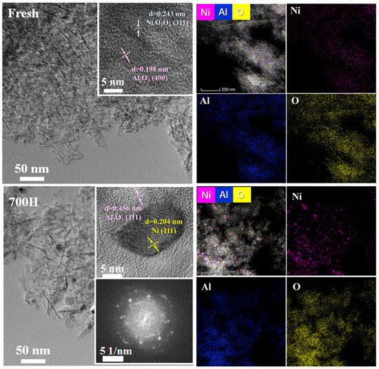 A TEM test was carried out to examine the structure of the catalyst samples, and significant differences in composition and crystal structure were observed, as demonstrated in Figure 8. The fresh catalyst sample showed the interplanar crystal spacing of 0.243 nm and 0.198 nm, which are attributed to the (311) plane of the spinel-structure NiAl2O4 and the (400) plane of the Al2O3, respectively. The catalyst sample reduced at 700 °C exhibited the interplanar crystal spacing of 0.204 nm and 0.456 nm, which corresponded to the (111) plane of metallic Ni and the (111) plane of the Al2O3, respectively. These results were consistent with the XRD findings. To further verify the catalyst composition and the distribution of Ni species on the catalyst surface, scanning transmission electron microscopy (STEM) and energy dispersive X-ray spectroscopy (EDS) mapping were performed. As shown in Figure 8, the fresh catalyst exhibited a uniform distribution of Ni species on its surface, because Ni species participated in the formation of the NiAl2O4 by interacting with Al2O3 so that the Ni species were extensively dispersed across the catalyst surface. In contrast, the formation of metallic Ni clusters with a clear crystalline structure was observed after reduction. These results suggest high temperature reduction caused an aggregation of metallic Ni to some extent, which was consistent with the literature [18,21]. Nevertheless, owing to the presence of the NiAl2O4 spinel structure, the particle size of the nickel species remained at the nanoscale after reduction, and there may exist a nanoconfined effect. In this context, the nanoscale environment created by the spinel structure restricted the movement and behavior of the nickel species, potentially enhancing their interaction with reactants, which was conducive to improving the performance of the catalyst [44].