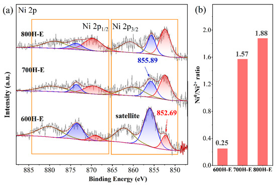 XPS results was depicted in Figure 9. Only a peak around 855.89 eV was detected for Ni 2p3/2 (Ni2+) in the catalyst samples with the reduction temperature no higher than 600 °C as well as the fresh sample. With increasing reduction temperature, the intensity of Ni2+ peak diminished, and peaks associated with metallic Ni (852.69 eV) were observed in the 700H and 800H samples [45], which aligns with the XRD findings.