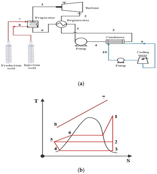 Figure 1. (a) Organic Rankine cycle (ORC) with the geothermal heat source; (b) the associated temperature–entropy diagram. Note: Part (b) of the diagram show isentropic processes from state 1 to state 3 for simplicity, but the actual processes are non-isentropic. - (2)