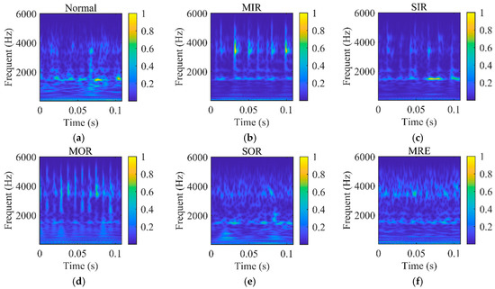 Selected time-frequency representations of various bearing fault conditions: (a) normal condition; (b) inner ring fault at a moderate level; (c) inner ring fault at a severe level; (d) outer ring fault at a moderate level; (e) outer ring fault at a severe level; (f) rolling element fault at a moderate level.