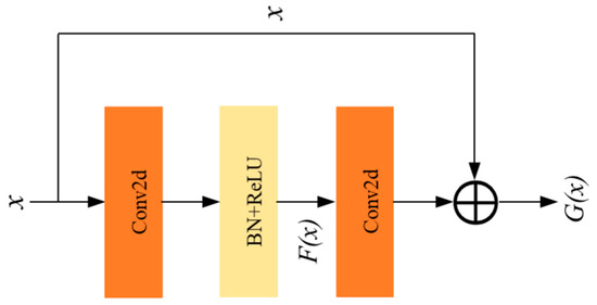 ResNet consists of several residual blocks, each forming a core part of the model. According to Figure 2, a residual block incorporates layers such as convolutional (Conv2d), batch normalization (BN), and ReLU activation functions. Inside a residual block, input data traverse both the residual path and the identity mapping path, and they are combined before passing through the ReLU activation function. Owing to the direct connection between the input and output in the residual block, effective error backpropagation is facilitated, which improves both the model’s training efficiency and generalization performance [35]. The operation of the residual block is expressed through the subsequent equation: