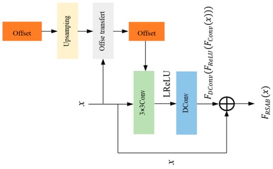 The RSAB includes a deformable convolution, a standard convolution, and a short skip connection and can be described as: