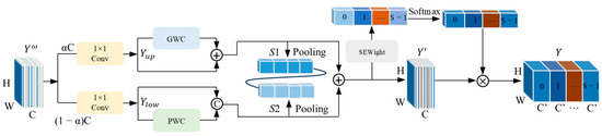 The segments αC and (1 − α)C are then transformed separately in the upper and lower layers. Efficient convolutions, GWC and PWC, are applied to extract key features and supplementary detailed features, respectively. These features are subsequently combined through channel-wise addition to produce the feature map :