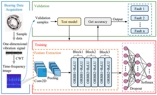 In the training phase, transformed time-frequency images are fed into the model proposed in this paper. Initially, we apply convolution along with max-pooling operations to capture superficial edge characteristics of the time-frequency map. Subsequently, deeper features are extracted using an arrangement of enhanced residual modules (Block1, Block2, and Block3) to increase the network depth. Integrating the SADNet structure within the residual module aids in eliminating image noise, reconstructing texture details, and bolstering the capacity to identify deep essential features. Next, Dropout is utilized prior to the fully connected layer to probabilistically disable certain neurons, promoting the acquisition of more robust information and reducing the risk of overfitting. Different fault types are classified using a Softmax classifier. After numerous iterations, the model undergoes training and reaches convergence. In the validation phase, the trained model is utilized for diagnostic assessment on the test set to appraise its recognition effectiveness and generalization strength.
