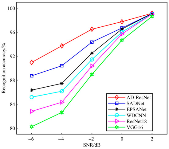 In real industrial settings, sensors that collect bearing vibration signals often face various noise interferences. In this section, to simulate different levels of environmental noise, 0 HP bearing data were used as experimental samples, and Gaussian white noise with SNRs of −4 dB, −2 dB, 0 dB, 2 dB, and 4 dB was added to the test set. To evaluate the noise resistance of the proposed model (AD-ResNet), its performance was contrasted with several commonly used deep learning models: VGG16, ResNet18, WDCNN [12], SADNet [36], and EPSANet [37]. The average outcomes from five experimental runs were considered for the final evaluation, as shown in Figure 8.