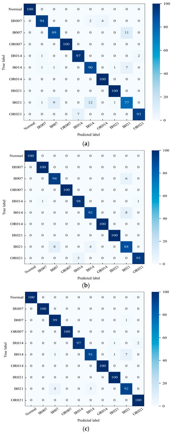 Confusion matrix plot of three different models under high noise: (a) ResNet18; (b) SADNet; (c) model in this paper.