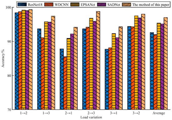 Bearings in industrial environments usually operate under a variety of load conditions; hence, strong generalization capabilities are essential for fault diagnosis methods. To evaluate the generalization capability of AD-ResNet, it was compared with WDCNN [12], ResNet18, SADNet [36], and EPSANet [37] in experiments involving varying load conditions. The final outcomes were derived from the average of five repeated experiments. The datasets with constant load were used as the training set, while datasets with different loads were used as the test set. For instance, “1→2” denotes training with data under a 1 hp load and testing with data under a 2 hp load. Figure 3 illustrates the experimental results.