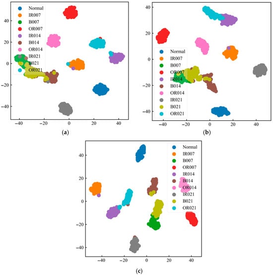 t-SNE visualization distribution of three different models: (a) WDCNN; (b) EPSANet; (c) model in this paper.