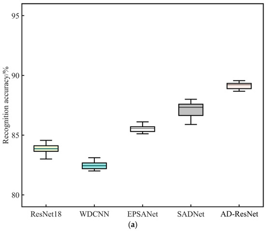 To further assess the noise resistance capability of the proposed AD-ResNet, boxplots were used to compare its performance with WDCNN [12], ResNet18, SADNet [36], and EPSANet [37]. Gaussian white noise with SNRs of −4 dB and −2 dB was introduced into samples at a rotational speed of 3900 r/min for experimental purposes. The findings from these tests are presented in Figure 12.