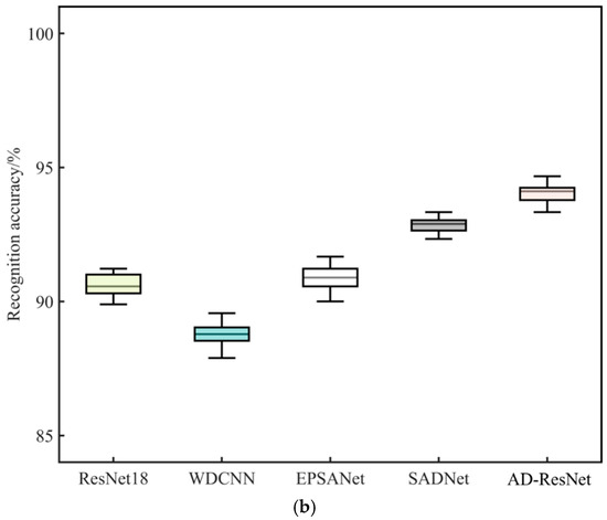 As demonstrated in Figure 12, AD-ResNet outperforms the other models by achieving the highest fault recognition rate and better stability under high noise conditions. This superior performance is attributed to the integration of the SADNet structure. Figure 12a indicates that, in comparison with the other four models, AD-ResNet showcases the highest average value and the smallest fluctuations, owing to the robust feature extraction capability provided by the IPSA module. These results demonstrate that the proposed model markedly enhances fault recognition rates under noisy conditions and exhibits strong robustness.