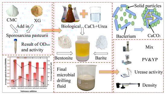 The MICP technique essentially utilizes specific urease-producing bacteria found in nature for decomposing urea to generate carbonate ions that react with metal ions in the environment to form carbonate precipitation [,,]. It effectively reduces greenhouse gas emissions and improves environmental carbon sequestration efficiency [,,,,]. Currently, Bacillus subtilis is commonly employed as the experimental strain due to its clear reaction mechanism, controllable reaction conditions, robust growth activity, and favorable environmental adaptability [,,,]. Chu et al. [] proposed utilizing the MICP technique to pre-generate calcium carbonate particles, also referred to as “biogrout”, to reinforce coarse sand. Their experimental results demonstrated that this technique effectively reduces the permeability coefficient of coarse sand. Li [] and Shi et al. [] found that xanthan gum can delay the bacterial growth rate without affecting bacterial activity. Saracho et al. [] highlighted the beneficial role of carboxymethyl cellulose in enhancing CaCO3 generation when the MICP technique is used. Choi. et al. [] showed that the addition of CMC increases microbial calcite precipitation. Through experiments, Jia et al. [] verified that incorporating montmorillonite effectively enhances CaCO3 precipitation compared to traditional MICP approaches []. The content of solid substances and the viscosity of biological mud directly influence the effectiveness of mud wall protection []. Drilling fluids with higher viscosity can significantly enhance bonding and wall protection in fractured and unstable strata [,]. The MICP technique facilitates the generation of calcite crystals, which possess excellent cementation properties. These crystals play a crucial role in forming calcium carbonate within loose and fractured bottom strata, thereby stabilizing the wellbore wall []. MICP technology offers a novel approach to addressing wellbore instability in gravel stratum. It could enable the creation of a microbial drilling fluid system that induces calcium carbonate precipitation within gravel stratum during drilling. This would enhance the mechanical strength of the wellbore, improve the integrity of the formation, and provide a new technical solution for effectively stabilizing wellbores in gravel stratum.