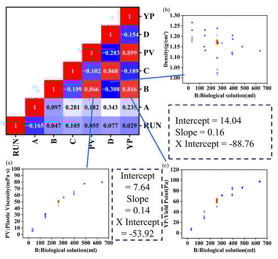 Correlation analysis between various factors and responses. scatter plots: (a) the interactions between B and PV; (b) the interactions between B and D; (c) the interactions between B and YP. (A: Bentonite; B: biological solution; C: barite; PV: plastic viscosity; D: density; YP: yield point. The symbol ‘-’ indicates a negative correlation between variables; “Run” refers to the number of experiments conducted).