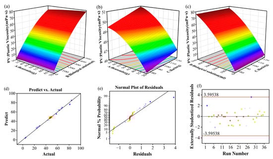 Three-dimensional response surface plots for various factors: (a) A and B, (b) A and C, (c) B and C; (d) diagnostic chart of predicted and actual values of plastic viscosity; (e) the normal graph of residuals; (f) residual and running chart.