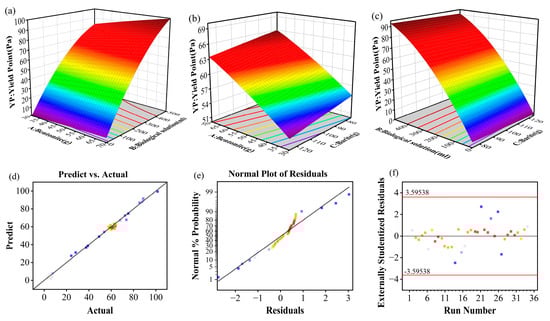 Three-dimensional response surface plots of various factors: (a) A and B, (b) A and C, (c) B and C; (d) diagnosis chart of predicted and actual values of yield point; (e) the normal graph of residuals; (f) residual and running chart.