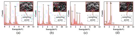 Figure 6 displays the energy-dispersive spectroscopy (EDS) spectrum, with a small image in the upper-right corner displaying the SEM image of the test material. Figure 6a,c depict samples incorporated with biological solution, while Figure 6b,d represent ordinary mud samples without added biological solution. In Figure 6a,c, characteristic peaks corresponding to calcium (Ca), sulfur (S), and barium (Ba) are evident. Notably, there is a significant increase in the peaks for elemental calcium compared to those of the untreated samples shown in Figure 6b,d. This suggests a marked rise in calcium content in the mud samples treated with the biological solution, potentially due to calcium being released from the solution or due to its reaction with the mud cake samples, aligning with the experimental expectations. In contrast, the changes in other elements aside from calcium were relatively minor. Specifically, in Figure 6b,d, the atomic ratio of sulfur (S) to barium (Ba) is 1, consistent with the atomic ratio of the molecular formula for barium sulfate, the primary component of the selected barite powder. This indicates that the large granular material with a smooth surface seen in the sample image is the barite component.