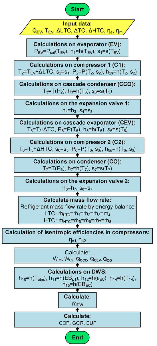 Figure 2 shows a schematic diagram of the algorithm used for the mathematical model. The input parameters were the heat load and the temperature of the EV (QEV, TEV), the difference between the inlet and outlet temperatures of the compressors (ΔLTC, ΔHTC), the difference between the cascade condenser temperature and the cascade evaporator temperature (ΔTC), and, finally, the combined motor and mechanical efficiency of the compressors (, ).