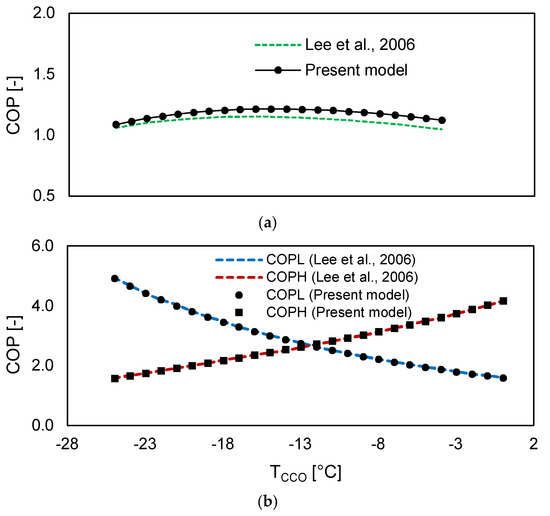 To prove the reliability of the mathematical model developed in this work, the theoretical study published by Lee et al. [32] was taken as a reference. Figure 3a compares the behavior of the global COP of the system between both models as the LTC condensation temperature (TCCO) varies. Meanwhile, Figure 3b shows the COP trends of LTC and HTC. The input parameters and specific design conditions are as follows: TEV = −50 °C, TCO = 35 °C, ΔTC = 5 °C, and TCEV = TCCO − ΔTC, where ΔTC is considered equal to 5 °C. Both graphs show good agreement between the results of the two models, with a maximum difference in the global COP of 7.1%.