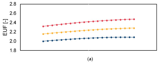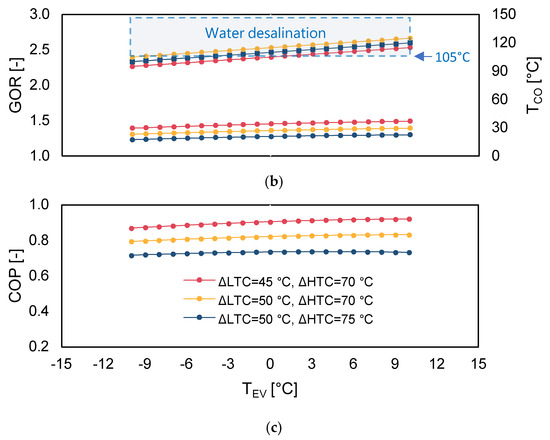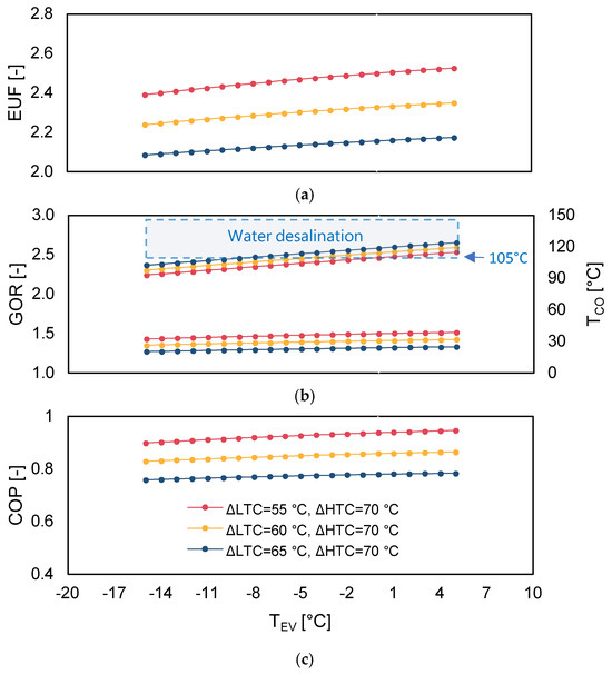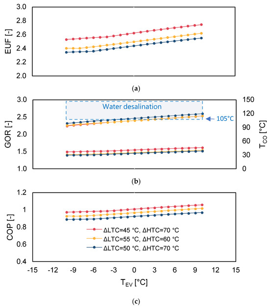 In this section, the performance of the cascade system integrated into the water desalination system is discussed. Figure 4, Figure 5 and Figure 6 present the performance of the cogeneration system in terms of the evaluation parameters EUF, GOR, and COP, as well as TCO, as a function of TEV and the temperature increases at the inlet and outlet of the compressors (ΔLTC and ΔHTC). Then, in Figure 7, the system’s performance is compared in terms of EUF, GOR, and COP under a specific operating condition. Finally, Figure 8, Figure 9 and Figure 10 present the system’s performance in terms of cogeneration as a function of TEV and a specific ΔLTC and ΔHTC condition.