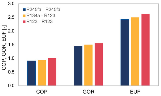 The R245fa used in LTC is of interest for cogeneration purposes, as the ΔLTC and ΔLTH in the compressors enable it to reach high condensation pressures and, therefore, high TCO. In addition, R245fa has a good heat capacity, which makes it effective for transferring heat from the LTH evaporator to the HTC condenser. As a result, R245fa achieved the highest values of TCO and QCO compared to other refrigerants. In general, R245fa is not characterized by offering the highest performance, as evidenced by this simulation, where the values of COP, GOR, and EUF were slightly lower than those of other refrigerants like R134a or R123. An improvement in system performance with R245fa was observed when it was used in both cycles of the cascade system.