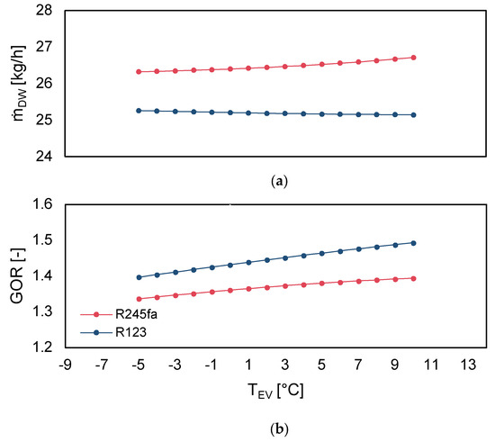 The system was initially evaluated with three refrigerant combinations—R123–R123, R245fa–R245fa, and R134a–R123—in the LTC and HTC, respectively, considering TCO = 105 °C, TEV = 0 °C, ΔLTC = 50 °C, and ΔHTC = 70 °C. The system achieved a COP of 1.01, 0.93, and 0.90 for the combinations R123–R123, R245fa–R245fa, and R134a–R123, respectively. The GOR was 1.55, 1.5, and 1.45, the EUF of 2.62, 2.5, and 2.42, and the desalinated water rate was 25.02, 24.83, and 26.39, respectively.