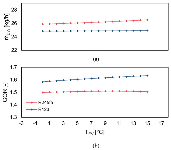 The mathematical model simulates cascade system integration based on the components’ internal temperatures. The temperatures were selected according to the requirements for the cooling effect in the EV and the thermal level necessary in the CO for the evaporation of brackish water. The operating conditions of the simulator were the following: QEV = 10 kW; TEV = −10 to 15 °C; ΔTC = 10 °C; ΔLTC (temperature difference at the inlet and outlet of the compressor 1) = 40–70 °C; and ΔHTC (temperature difference at the inlet and outlet of the compressor 2) = 40–70 °C.
