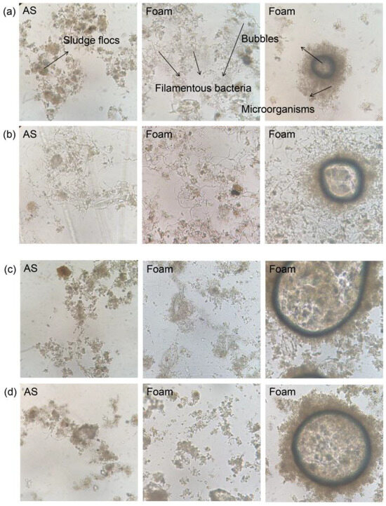 Figure 3 shows the AS and foam structures observed by ESEM. It was found that (Figure 3b right) there were plenty of filaments in the range of 1.4 μm in the foam of sample 2, which was consistent with the diameter of “Nostocoida limicola” II. A moderate amount of NALO was also identified in the foam of sample 2 (Figure 2b). Especially, instead of morphotype of filamentous, Gram-positive and Gram-negative rods were observed in sample 3 (Figure 2c) and sample 4 (Figure 2d), combined with the ESEM images (Figure 3c,d); the rods had a cell size of about 0.6 × 1.2–2.6 μm.