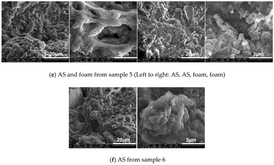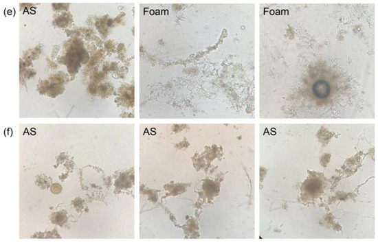 Light micrographs of activated sludge (AS) and foam in sample 1 (a), sample 2 (b), sample 3 (c), sample 4 (d), sample 5 (e), and sample 6 (f). In sample 6, no foam was detected. (Light-microscope at 200×).