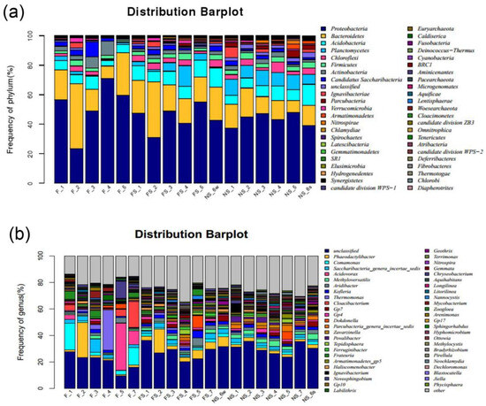 Microbial community structures: (a) at phylum level; (b) at genus level.