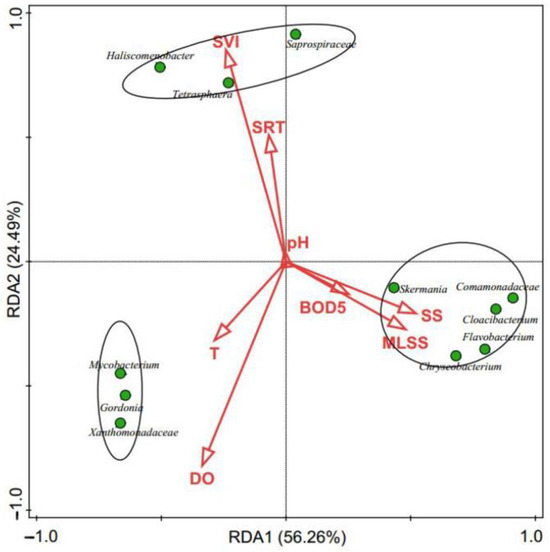 To further understand environmental and operational variables responsible for the differences in foaming-related bacteria with the sludge foaming events in different WWTPs, RDA using a vegan package of R language was performed, on the basis of bacterial classification results. As shown in Figure 6, the results of RDA clearly indicate that the prevalence of specific microorganisms causing sludge foaming, such as Haliscomenobacter hydrossis Haliscomenobacter, “Nostocoida limicola” II Tetrasphaera, and Saprospiraceae in sample 2, were positively correlated with SVI and show a certain degree of negative correlation with DO, especially “Nostocoida limicola” II Tetrasphaera. It can not only cause sludge foaming but also result in sludge bulking in WWTPs [37,50,51]. Therefore, its proliferation can be controlled by reducing the SRT, thereby restoring microbial diversity. On the one hand, a reduction in SRT can eliminate filamentous bacteria with long sludge ages; On the other hand, as SRT decreases, the amount of sludge wasted increases correspondingly, which also increases the sludge load to some extent. Skermania piniformis Skermania, Comamonadaceae, Type 1863-3 Cloacibacterium, Type 0092-2 Flavobacterium, and Type 1863-3 Chryseobacterium, mostly in sample 1 and sample 5, were positively correlated with MLSS and SS in influent, indicating that the foaming sludge can be controlled by the decreasing of MLSS and SS in influent; DO and temperature were linked to changes in Mycobactrium, Gordonia, and Xanthomomadaceae, although its effect on them was small. Over-proliferation of filamentous bacteria can be induced by excessive or insufficient dissolved oxygen levels. Consequently, the aeration volume must be controlled at an appropriate level to ensure adequate mixing and nitrification within the system.