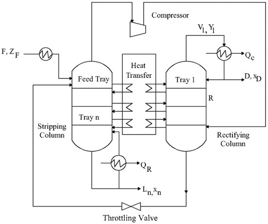 At times, it proves advantageous to alter the typical process layout intentionally, disrupting the symmetry between the rectifications and stripping sections to notably enhance operational efficacy. However, such modifications invariably incur a trade-off, as they may lead to a degree of energy efficiency loss [11,15,17]. To establish the necessary temperature gradient, the vapor exiting the top of the stripping segment undergoes direct recompression, ensuring that the rectifying portion operates at a higher pressure compared to the stripping segment. Unlike VRC, where the heat pump must span the entire temperature gradient within the system, the primary advantage of HIDiC lies in its energy-saving potential relative to VRC. This advantage stems from the fact that the compression workload in HIDiC is confined to bridging the temperature differential across the height of the stripping section alone. Additionally, the physical stature of an HIDiC may be significantly reduced, potentially amounting to just half the height of a VRC under optimal conditions.