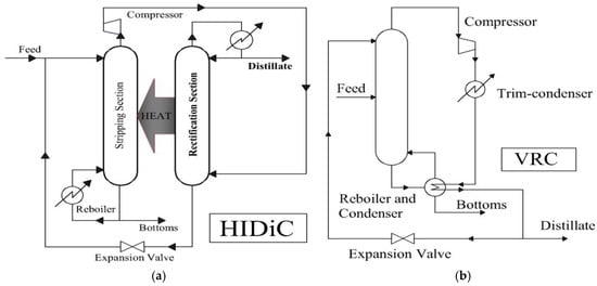 Furthermore, for the sake of comparison and comprehension, let us examine the fundamental flow diagrams of VRC and HIDiC depicted in Figure 2.
