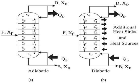 Despite its capital intensity, VRC offers substantial energy savings potential, particularly in the separation of close-boiling mixtures, where high reflux ratios and significant reboiler duties are required for efficient separation. Successful implementation requires careful consideration of operational parameters such as compressor performance, heat exchanger design, and process control strategies to optimize efficiency and achieve long-term cost-effectiveness [53,54,55,56]. As an illustration, the substantial reboiler duty of a cutting-edge propylene-propane splitter handling a feed rate of 110 tons per hour can reach approximately 90 megawatts [57,58]. Introducing diabatic distillation as shown in Figure 3b, it represents a remarkable advancement in energy-saving strategies within single distillation columns [59]. In contrast to conventional adiabatic distillation as in Figure 3a, a diabatic column reconfigures the traditional setup by integrating the condenser and reboiler within the rectification and stripping sections, respectively. This innovative approach facilitates a more efficient utilization of heat by gradually supplying and removing heat along the stripping and rectification sections, optimizing the processes of condensation and evaporation. By redistributing heat exchange functionalities within the column, diabatic distillation demonstrates significant potential for enhancing energy efficiency and reducing overall energy consumption [27,60,61,62].